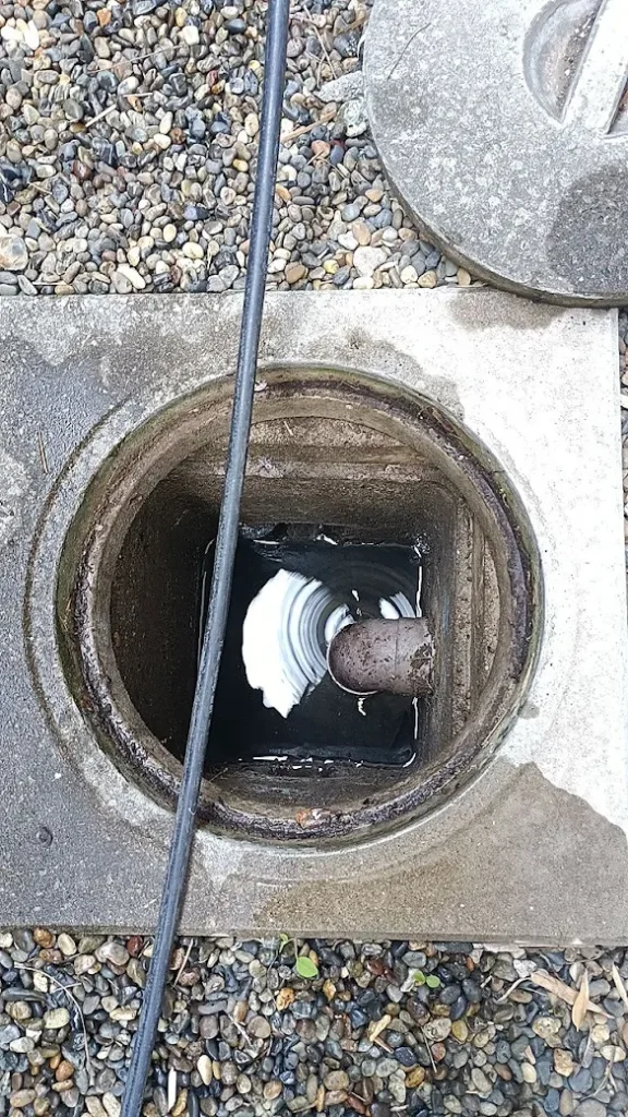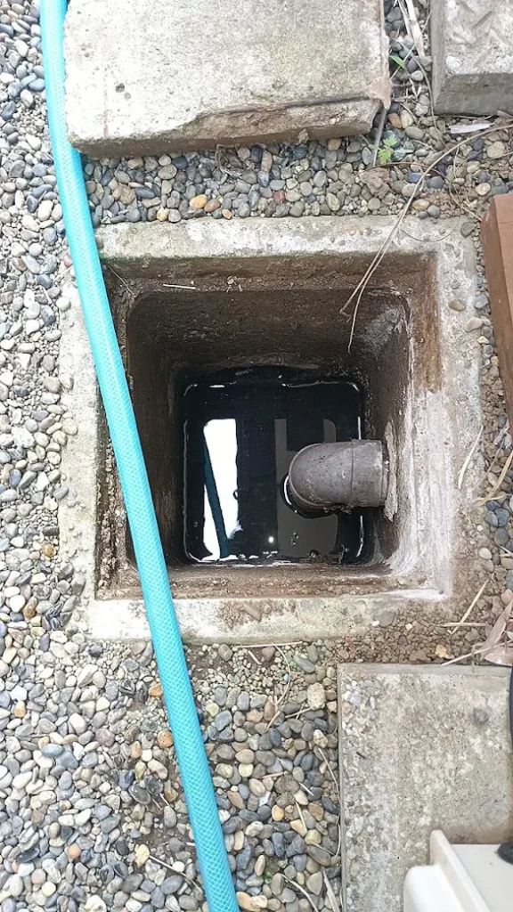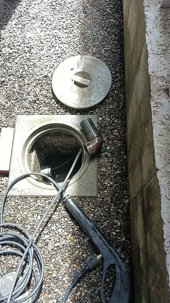 高圧洗浄のワイヤーで、排水管を洗浄しています。